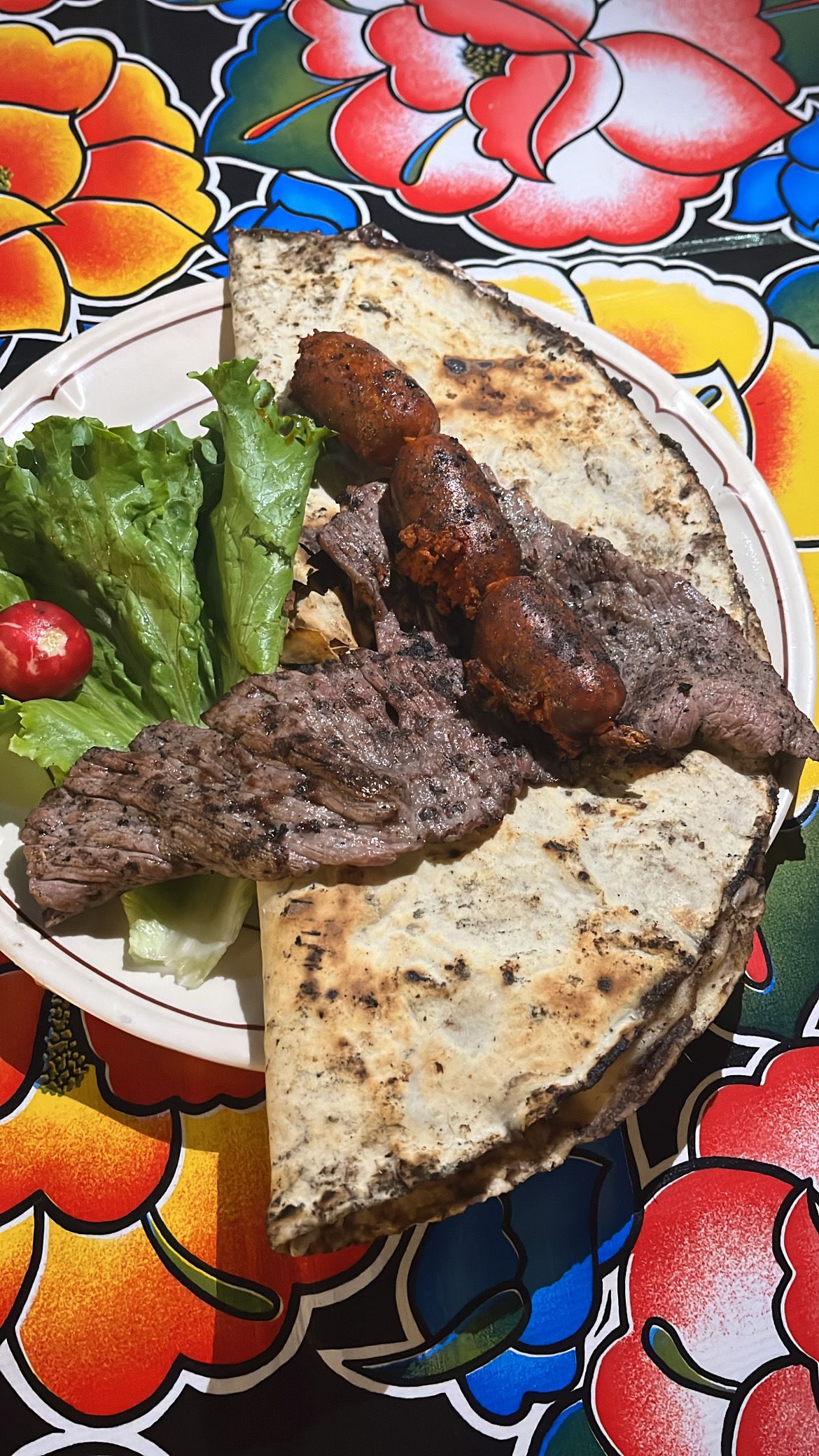 Tlayuda with tasajo (beef) and chorizo