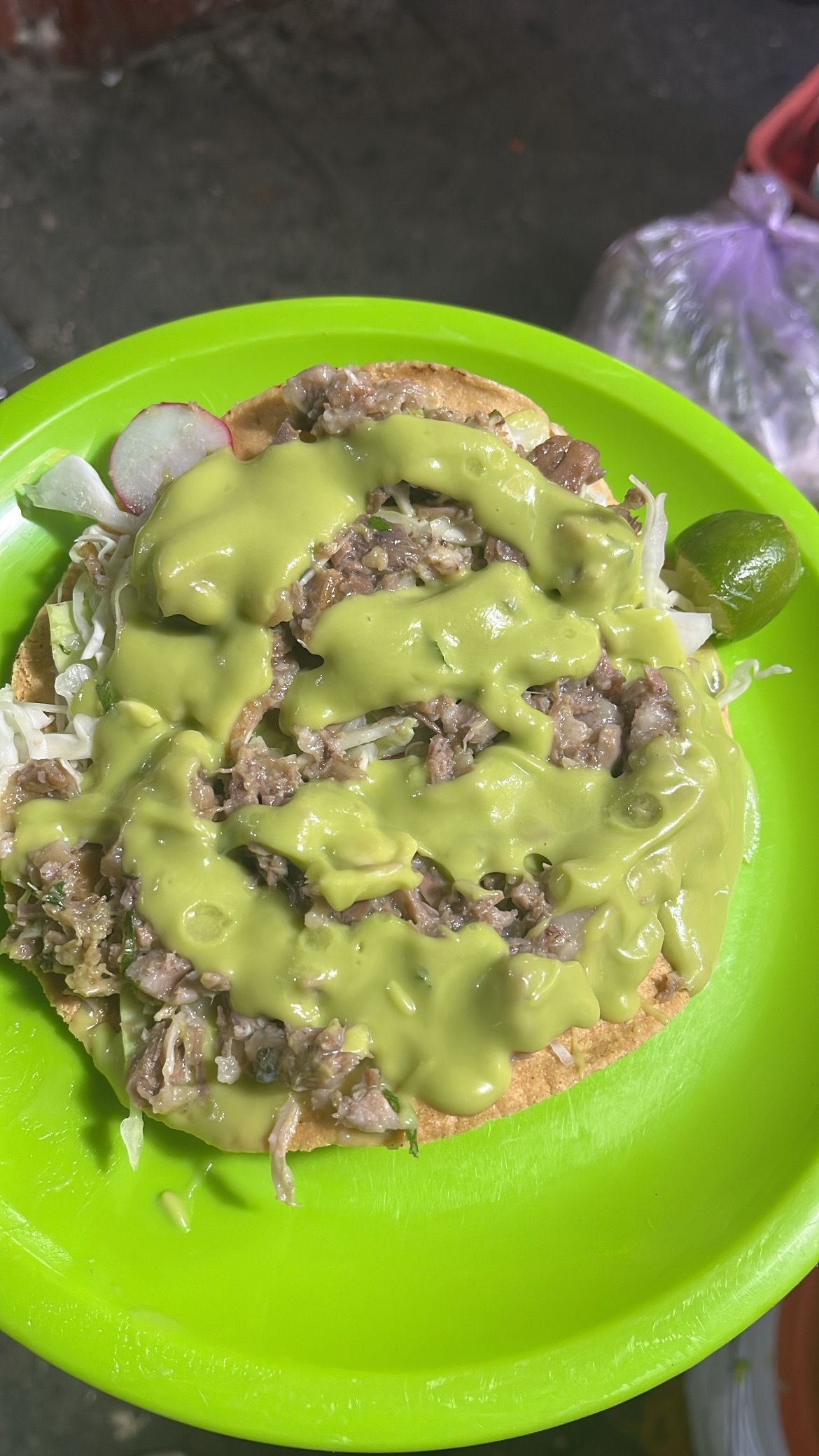 My favorite bite of the trip was cabeza de puerco—pork head meat served on a crispy tostada with shredded cabbage, radishes, bright tomatillo salsa, and a fiery habanero salsa for heat. Rustic, balanced, and unforgettable.