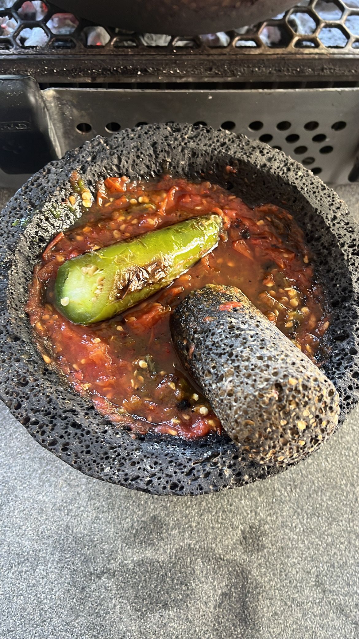 Grind the salsa ingredients in a molcajete or blend to your preferred texture.